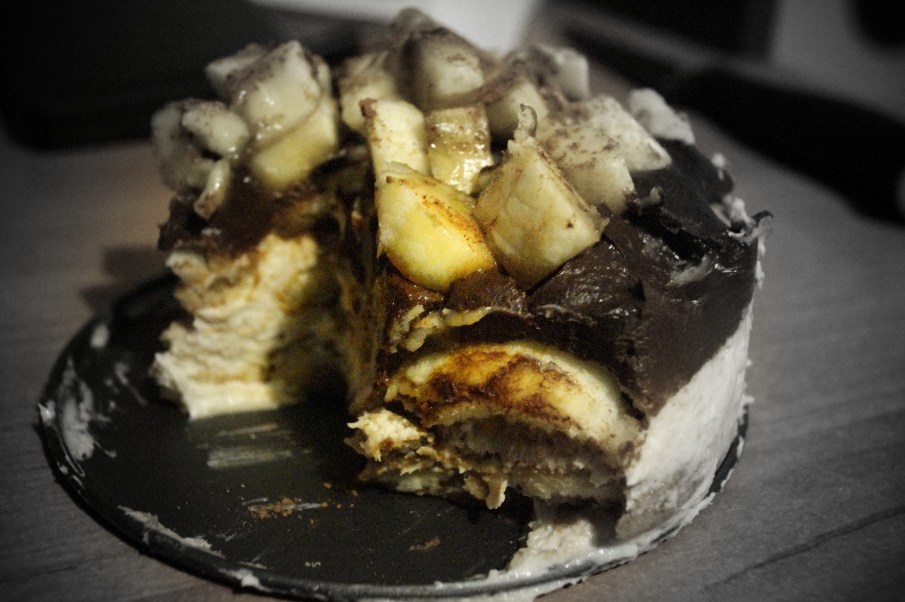 Na tortu poliatu čokoládovou penou som poukladala na kocky nakrájanú druhú polovicu banánu a posypala škoricou.